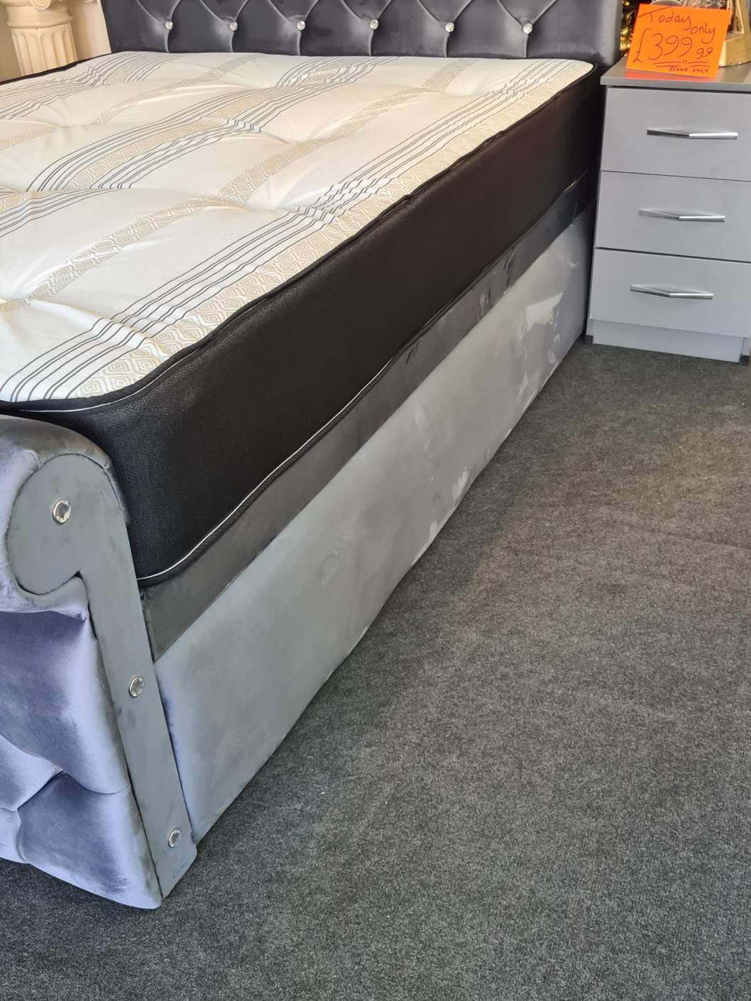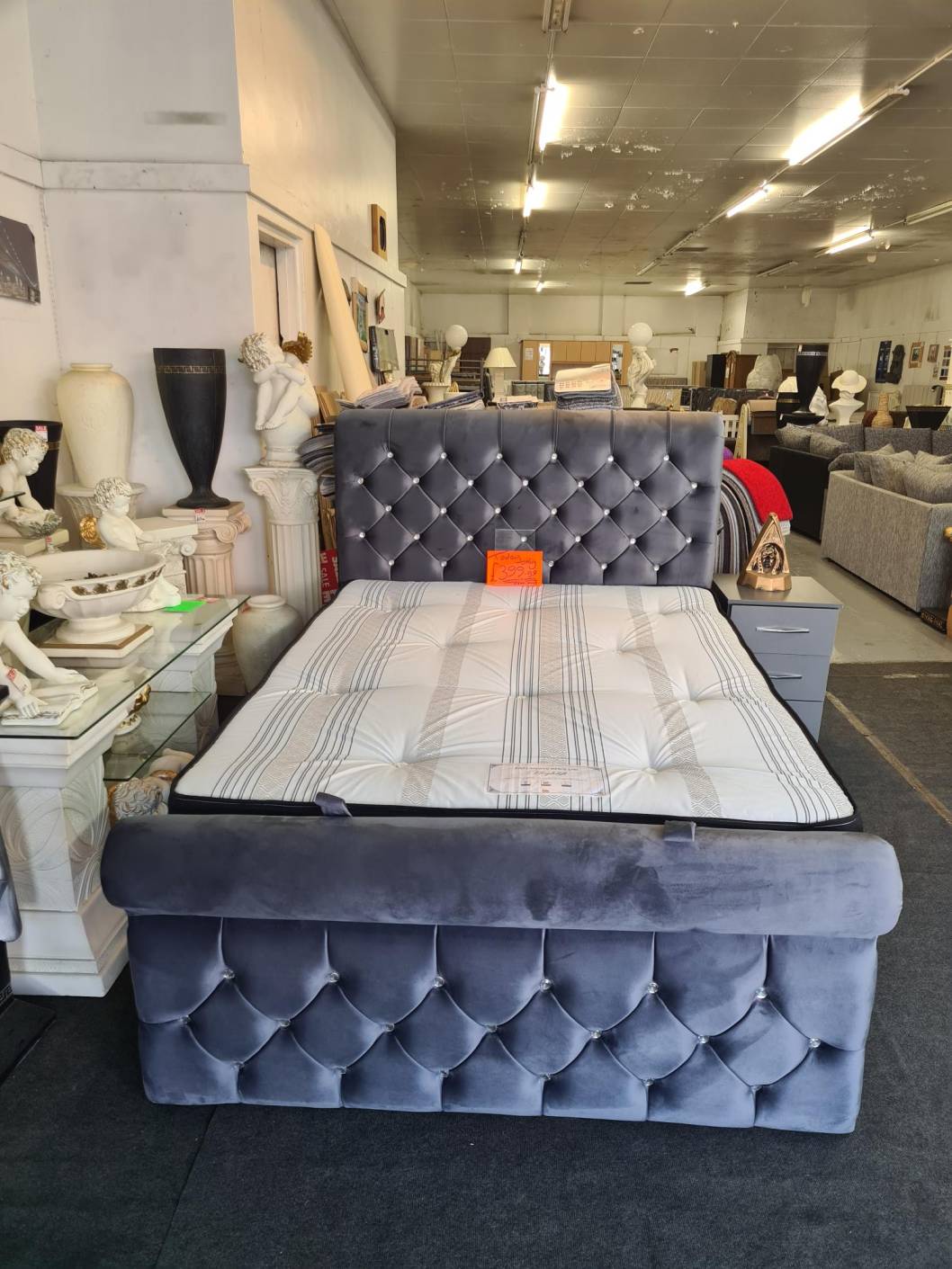 4.6 sleigh ottoman in plush fabrics with 4 gas lift bars and solid top, with either buttons or diamontes.