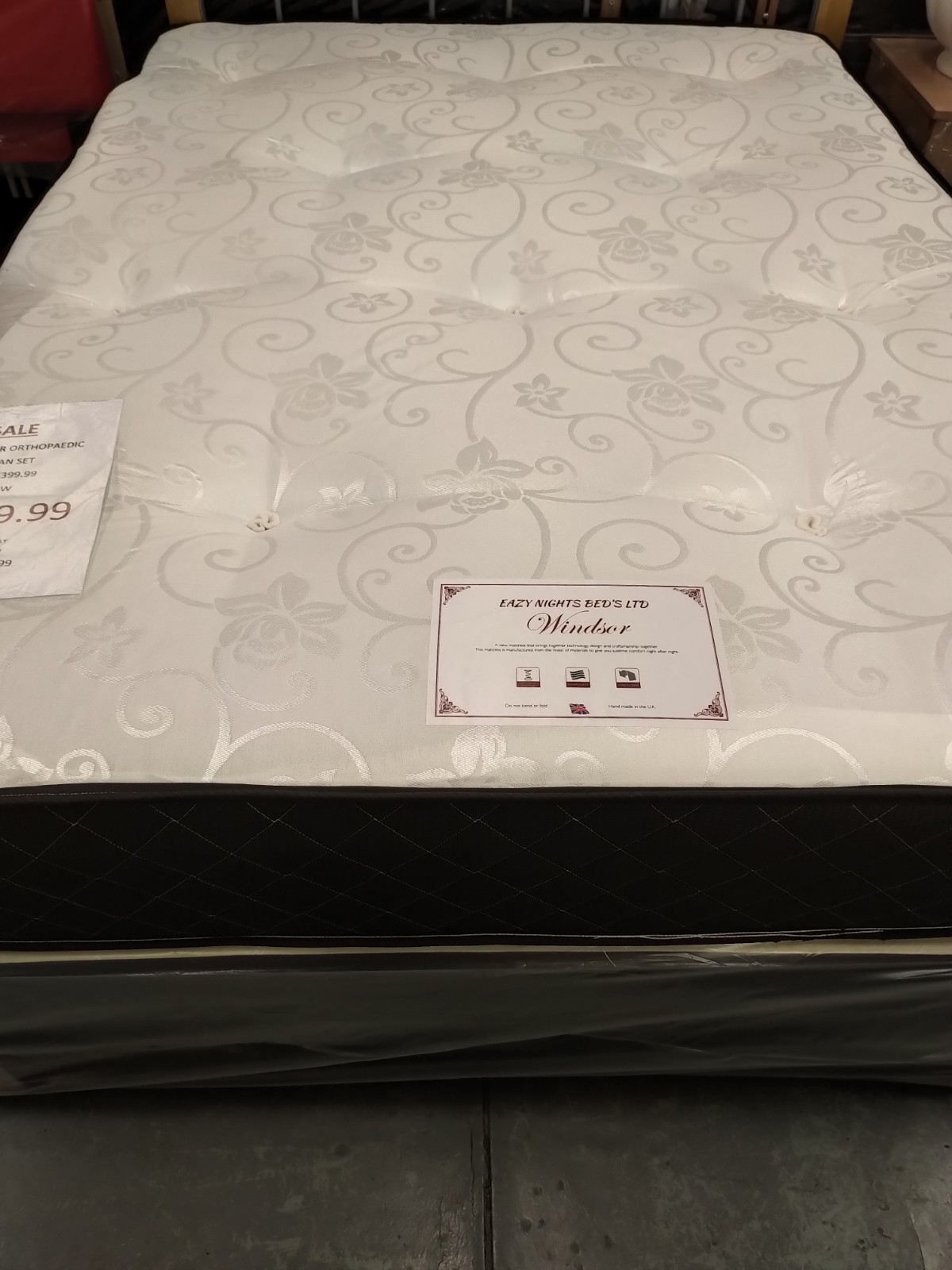 We are doing the 4.6 Windsor orthopaedic divan set which has a 10 inch deep open coil mattress and black divan base for only £199.99 this month. The mattress is 10 inches deep with high quality fillings and an ortho sprung unit and comes with a 1 year manufacturers guarantee against manufacturing defects.