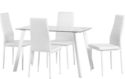 Abbey dining set in white with glass top and padded chairs . 120cm x 70cm