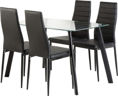 Abbey dining set with a glass top and padded chairs in black, 120cm x 70cm