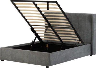 Amelia plus 4.6 storage bedframe with sprung slats and fabric base, headboard has lovely wings ,mattress extra. self assembly. 1585 x 2130 x 1160