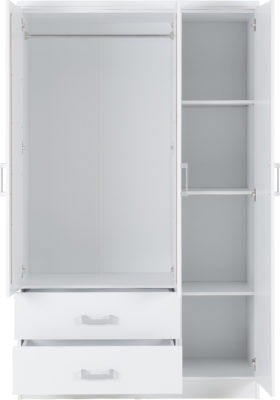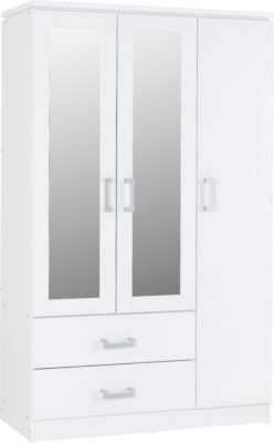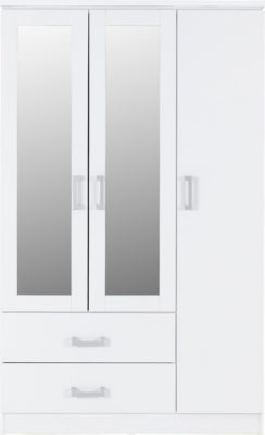Charles 3 door 2 drawer mirrored wardrobe in white , drawers have metal runners, small section with shelves. Self assembly.