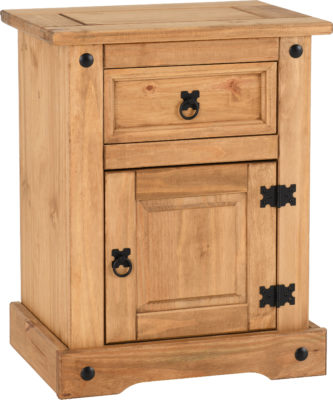 Corona 1 drawer 1 door bedside cabinet finished in distressed waxed pine, self assembly.