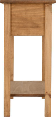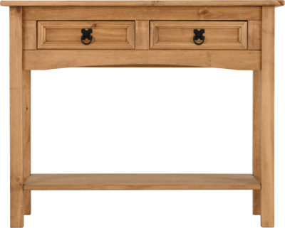 Corona 2 drawer console table with shelf finished in distressed waxed pine , self assembly.900 x 345 x 730