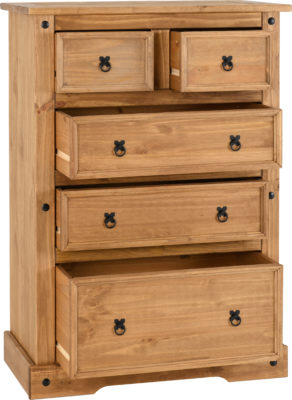 Corona 3 + 2 drawer chest in distressed waxed pine finish , self assembly.
