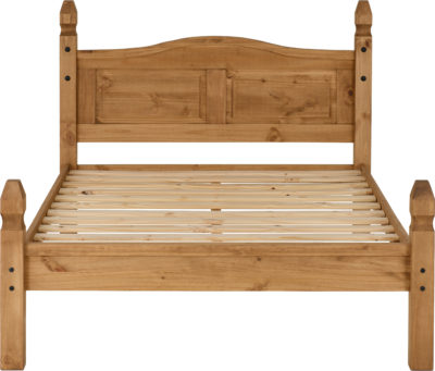 Corona 4.6 bedframe with Low footend finished in distressed waxed pine, wooden slats with extra support middle rail . self assembly.