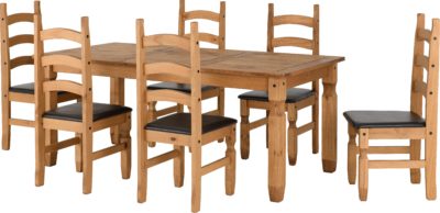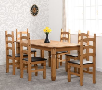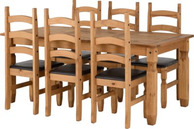 corona 6ft dining set with 6 upholstered brown pu seat chairs finished in waxed pineĀ self assembly, size 1820 x 920 x 755