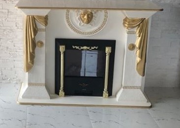 Fireplace in off white and shown with gold with black and gold fire , size 145cm x 50cm with a height of 105cm