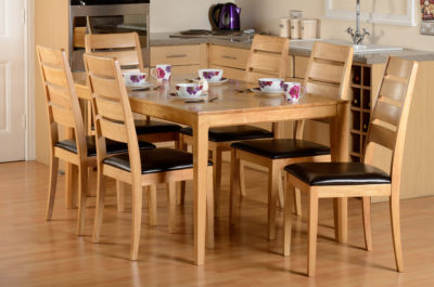 Logan large dining set with 6 brown upholstered seat dining chairs finished in oak varnish. Self assembly 1500 x 900 x 750