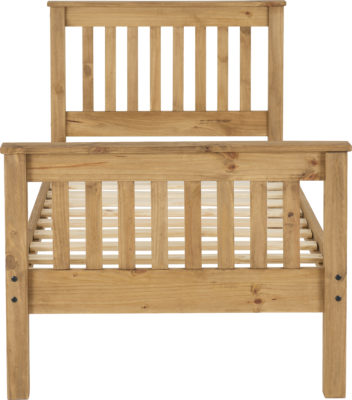 Monaco 3ft wooden bedframe with high footend finished in distressed waxed pine, wooden slats, mattress extra self assembly. 1025 x 2040 x 1025