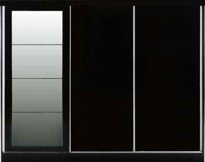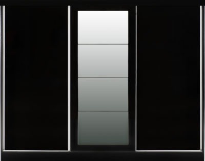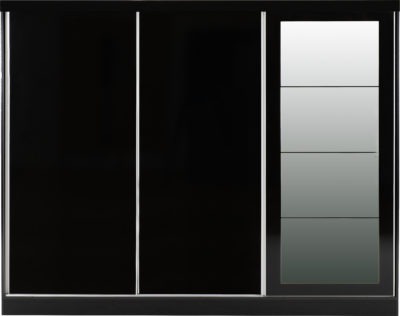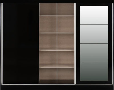 Nevada 3 door sliding wardrobe in black gloss with 1 mirror door .with internal shelves and rails on both ends .Middle section contains shelves