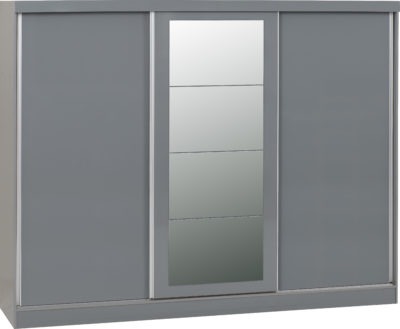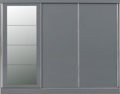Nevada 3 door sliding wardrobe in grey gloss with 1 mirror door .with internal shelves and rails on both ends .Middle section contains shelves