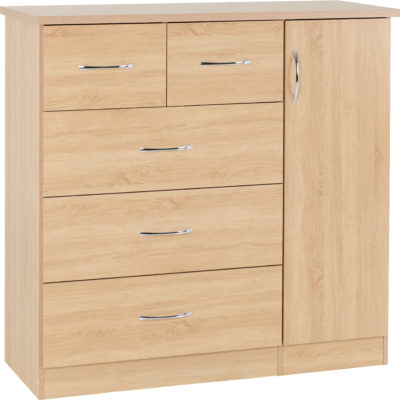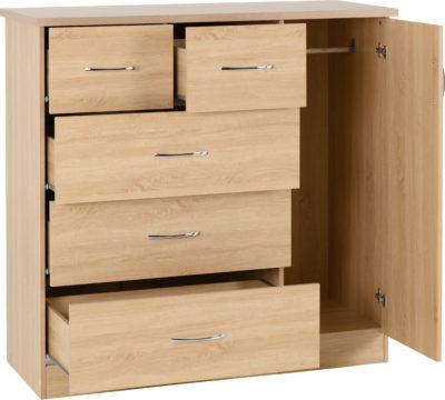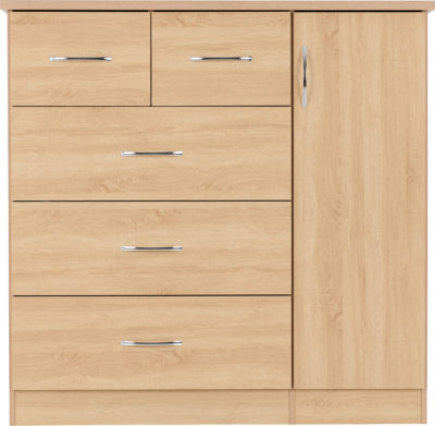 Nevada 5 drawer low wardrobe effect finished in sonoma oak effect with metal runners on drawers.