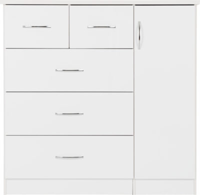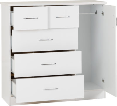Nevada 5 drawer low wardrobe effect finished in white gloss with metal runners on drawers.