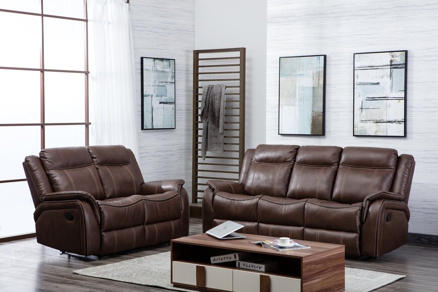 New Hampshire 3str and 2str recliner set in tan Leather aire with sprung interior seating with padded arms and comes with 12 month manufactures warranty. It has 4 recliners and is also available in black