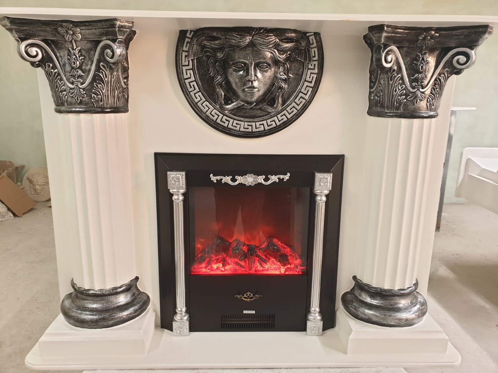 Off white and silver fireplace shown with black and silver fire, size 145cm x 50cm with a height of 105cm