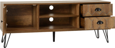 Ottowa 1 door 2 drawer TV unit finished in medium oak effect and black, self assembly.1300 x 395 x 505