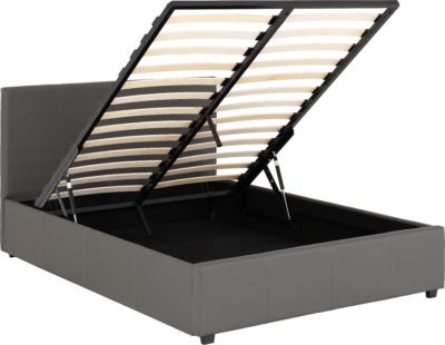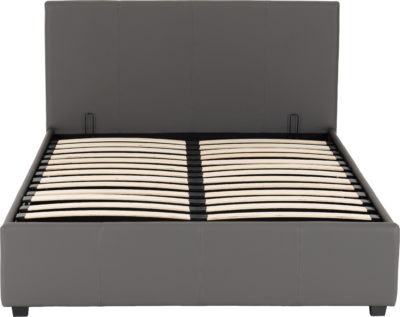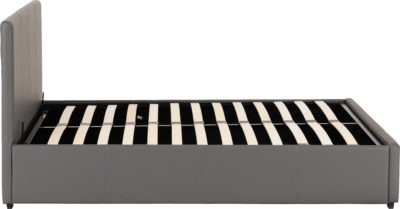 Prado plus 4.6 storage bedframe with fabric base and sprung slats finished in grey faux leather, base gas 2 gas lift bars , self assembly. mattress extra.1440 x 2035 x 970