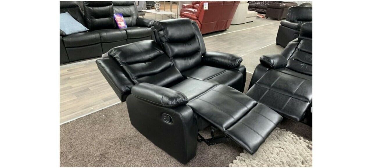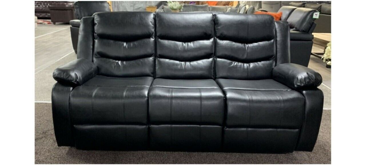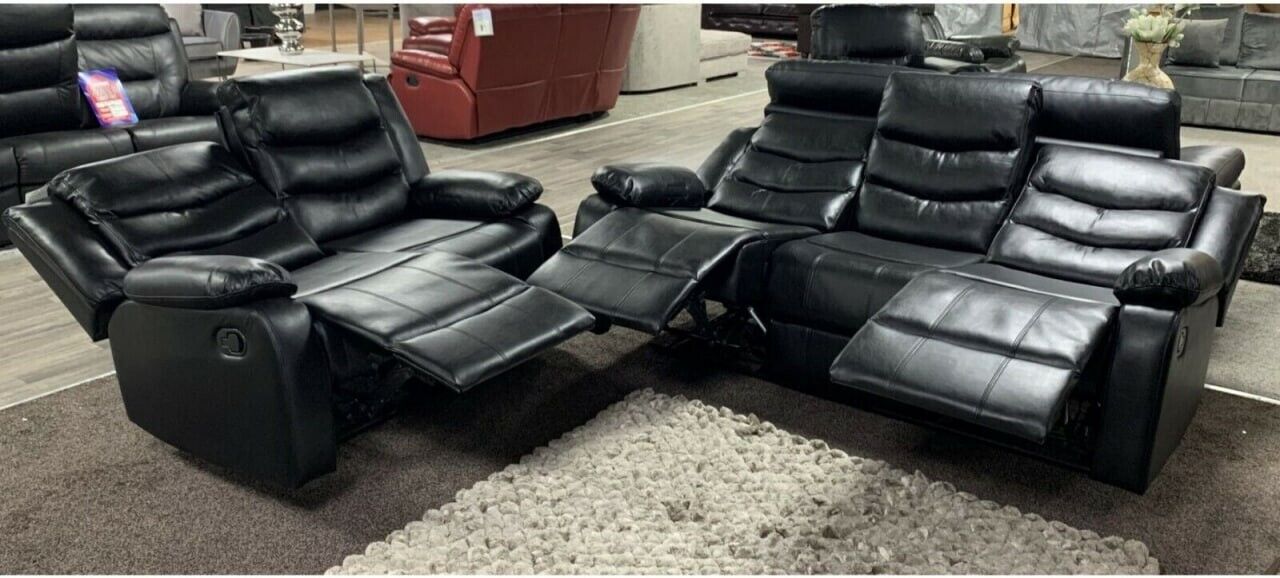 The Roma Recliner sofa set is the top of comfort with its laid-back cushions and reclining capabilities. You will feel like you are on a getaway every time you take time to enjoy the Roma set. Reclining Sofa set can add a classy and formal appeal to any sitting room or formal living room. This handsome reclining set comfortably accommodates five people on its three and two-cushion seat design. . The Roma Recliner furniture is upholstered in bonded leather.