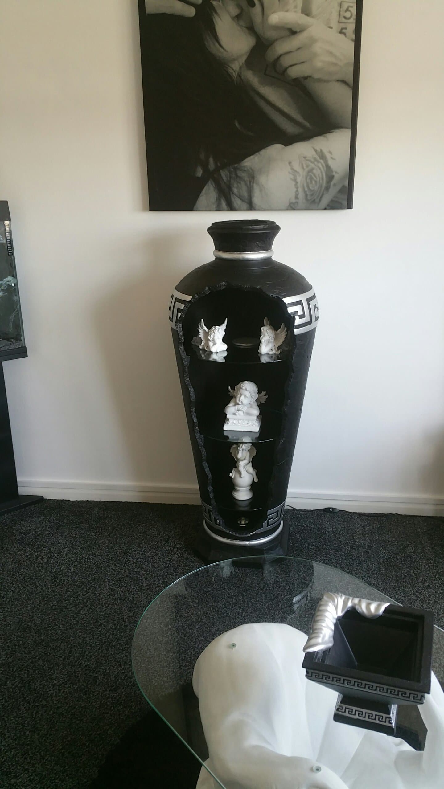 | this is a unique piece with lots of character. the vase is open fronted design with 3 glass shelves and has a halogen light at the top and at the bottom. this piece has been a hit since its arrival.Also available in different colours |